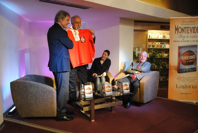 Autor je na kraju promocije Duletu Saviću poklonio repliku dresa koji je naša reprezentacija nosila na Svetskom prvenstvu u Urugvaju.