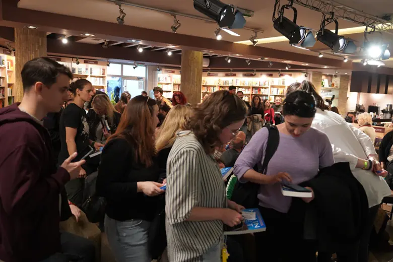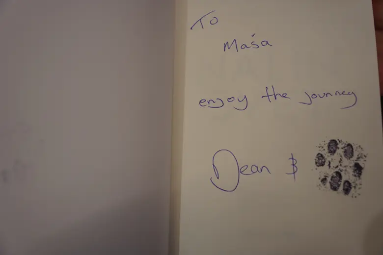 Din je stprljivo potpisivao svoju knjigu preko dva sata, razgovarao sa čitaocima, razmenjivao iskustva oko odgajanja Nale, ukazivao na značaj brige o životinjama... Svi su uz potpis dobili i pečat kao otisak Naline šape, jer je autorstvo obostrano, samo što je Din sve zapisao.